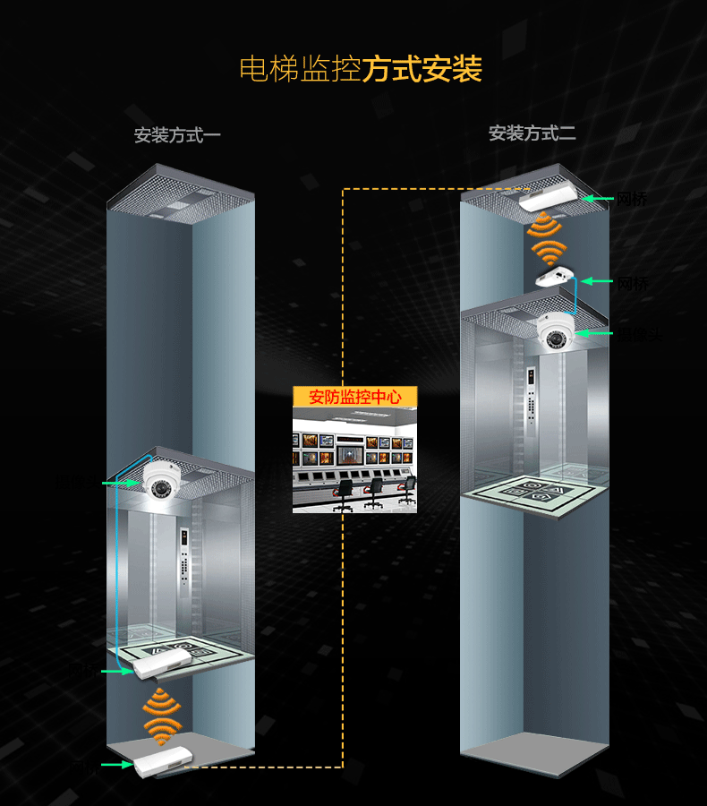 電梯內(nèi)底部已全部封閉,無法使用就近光纖節(jié)點(diǎn)對電梯視頻數(shù)據(jù)做傳輸,而電梯頂部留有電梯線纜口。這種情況下利用電梯轎廂與頂部的空隙空間,在電梯轎廂頂部安裝1臺專用無線網(wǎng)橋與電梯線纜口安裝的1臺電梯專用無線網(wǎng)橋進(jìn)行數(shù)據(jù)傳輸,通過網(wǎng)線使用交換機(jī)把各電梯的視頻數(shù)據(jù)集中,最后通過豎井使用網(wǎng)線或者在樓層頂!使用一對電梯專用網(wǎng)橋,把集中的視頻數(shù)據(jù)傳回機(jī)房,通過硬盤錄像機(jī)在大屏上顯示,整套方案,安裝簡單,施工工期短,便于后期問題的排查,維護(hù)。